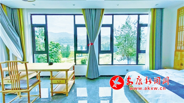 半山腰的獨(dú)棟別墅白墻黑瓦,飛檐峭壁,處處滲透著平淡質(zhì)樸的古典韻味?;张山ㄖ骋星嗌?,面朝峽谷,壩河水在谷間緩緩流淌。別墅里每一間都布置得精致高端,站在二樓落地窗前,觀連綿青山,賞花鳥飛禽,讓人陡然間心靜如水。