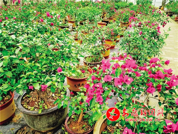 園區(qū)負(fù)責(zé)人吳斌告訴我們,到了春天,三角梅的枝條上會長出一片片嫩綠的葉子,隨著時(shí)間的變化,枝頭的葉子慢慢變紅,遠(yuǎn)遠(yuǎn)看去就像一朵朵怒放的梅花,花朵里面有花蕊,看上去就像一朵三角形的梅花,所以人們叫它三角梅。三角梅的顏色以紅、粉、黃、紫、橙、白這幾種顏色為主,而且這幾種顏色還可以細(xì)分,比如紅色可以分成重紅、玫瑰紅,黃色可以分為重黃和加州黃,顏色豐富,特別惹人喜愛。