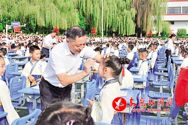 為傳承中國(guó)傳統(tǒng)文化,進(jìn)一步加強(qiáng)學(xué)生文明禮儀教育,日前,安康高新區(qū)第一小學(xué)舉行一年級(jí)新生開(kāi)筆禮及優(yōu)秀學(xué)生表彰活動(dòng)。千名一年級(jí)蒙童身著漢服,由班主任帶領(lǐng)跨過(guò)啟蒙門(mén),正衣冠、感恩鞠躬、朱砂啟智、擊鼓明志、開(kāi)筆啟蒙,接受中國(guó)傳統(tǒng)文化的洗禮,領(lǐng)略傳統(tǒng)文化的魅力。(張凌云 攝)