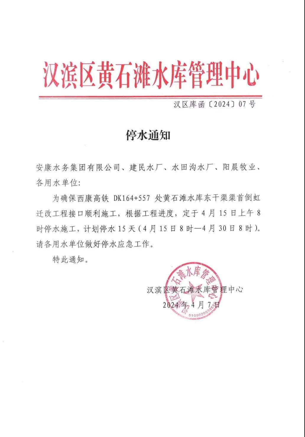 本網(wǎng)訊 4月12日,安康水務(wù)集團(tuán)有限公司供水分公司發(fā)布停水通知:因西康高鐵DK164+557處與黃石灘水庫東干渠渠首倒虹豎井正交,需對東干渠倒虹進(jìn)行遷改。根據(jù)遷改工程進(jìn)度和供水接口轉(zhuǎn)換施工需要,將于4月15日上午8時起對黃石灘水庫干渠進(jìn)行停水施工(工期15天)。