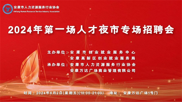 為有效保障企業(yè)用工需求,促進(jìn)未就業(yè)高校畢業(yè)生、退役軍人、城鎮(zhèn)失業(yè)人員、返鄉(xiāng)農(nóng)民工等各類人員就業(yè),安康市創(chuàng)業(yè)就業(yè)服務(wù)中心、安康高新區(qū)創(chuàng)業(yè)就業(yè)服務(wù)局定于2024年8月2日(星期五)在安康高新區(qū)萬達(dá)廣場1號門舉辦2024年第一場人才夜市專場招聘會,現(xiàn)將活動事項(xiàng)公告如下: