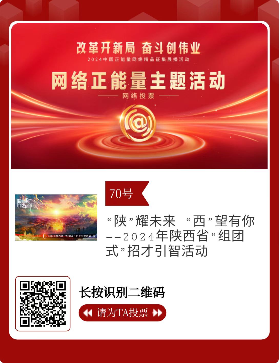 陜西省32件作品進(jìn)入投票環(huán)節(jié),投票時(shí)間為2月15日至2月21日,投票結(jié)果將作為中國(guó)正能量網(wǎng)絡(luò)精品遴選的重要參考。中國(guó)正能量網(wǎng)絡(luò)精品,期待每一個(gè)充滿正能量的你投出點(diǎn)贊一票。
