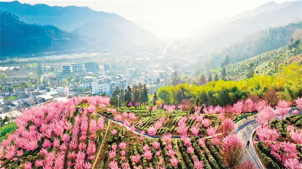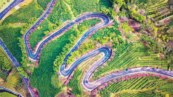 沿著茶山步道拾級而上,茶農(nóng)采青的竹簍與游人拍照的紗巾在梯田間次第閃現(xiàn)。粉白相間的梅花如云絮般綴滿枝頭,風過處,花瓣簌簌落入茶叢,為嫩綠的新芽染上淡淡馨香。遠處黛瓦白墻的徽派民居與近處起伏的茶壟構成天然畫框,無人機視角下,蜿蜒的茶道如同玉帶纏繞山腰,將紅楓、櫻花、梅林串成斑斕的珠鏈。
