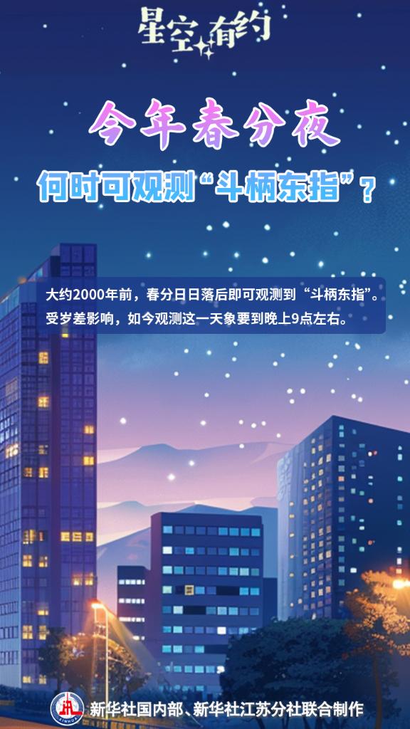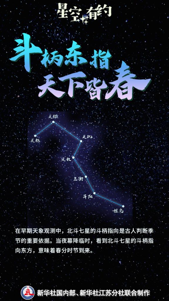 3月20日將迎來春分節(jié)氣。這一時節(jié)草長鶯飛、花滿枝頭,天上的星斗也指示著春天的到來。我國古代有“斗柄東指,天下皆春”的說法,意思是當(dāng)夜幕降臨時,看到北斗七星的斗柄指向東方,意味著春分時節(jié)到來。