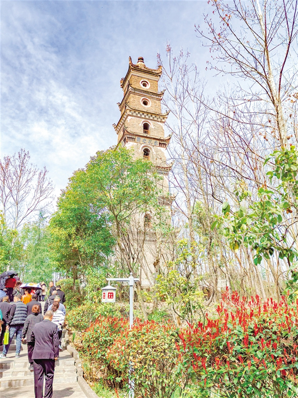 這時,塔側(cè)傳來歡快的鑼鼓聲,循聲望去,是一段十幾米的孝義文化長廊,一組男女或站或坐敲打著響器,使奠安塔不再寂寞。廊道的另一頭連接著奠安公園,環(huán)形觀景步道上擠滿了游覽的人。春分時節(jié),杏花正在萌發(fā),桃花含苞待放,倒是紅葉李花開正艷,細小如甲的花瓣布滿枝頭,零落軟泥上,雪白一片,仿佛成了李花的世界。舉目四望,花草清新,小學生在撿拾垃圾,胸前的紅領(lǐng)巾在陽光的照射下熠熠生輝,與周遭綠植映襯,絢爛了滿園春色。