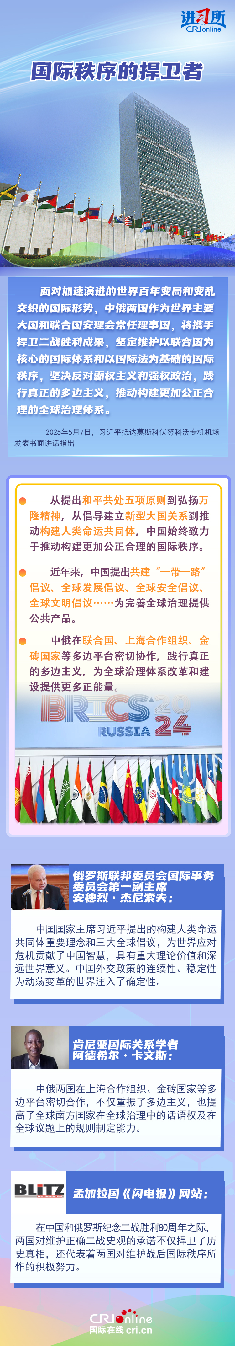 “兩國人民用鮮血和生命凝結的深厚情誼,如黃河之水奔騰不息,似伏爾加河寬廣深沉,成為中俄世代友好的不竭源泉?!苯衲晔侵袊嗣窨谷諔?zhàn)爭、蘇聯(lián)偉大衛(wèi)國戰(zhàn)爭暨世界反法西斯戰(zhàn)爭勝利80周年,也是聯(lián)合國成立80周年。在這一重要歷史時間節(jié)點,習近平主席此訪不僅為中俄關系發(fā)展注入強勁動力,也向世界宣示中俄兩國攜手捍衛(wèi)二戰(zhàn)勝利成果的堅定意志。