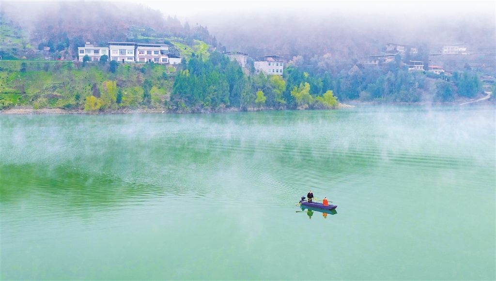 寒冬時節(jié),瀛湖蓄水,沙坪河展現出不同往昔的靜謐風姿。清晨,薄霧如紗,輕輕覆于江面。遠山輪廓在氤氳中淡去,近水卻愈顯澄明,倒映著天際微光。時有早行的客船從霧中緩緩現出身形,馬達聲不時驚起三兩水鳥;漁人輕搖小舟,如在云中穿行。這朦朧流動的晨景,恍若水墨漫染的仙境。