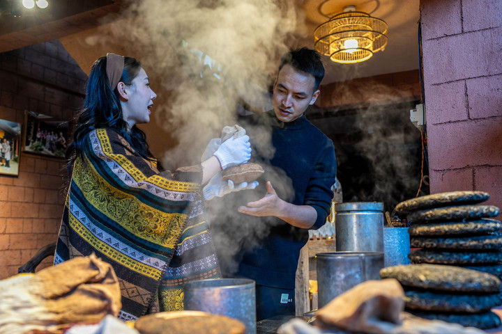 2024年4月13日,一名俄羅斯塔斯社記者(右)在大理市體驗(yàn)包裝下關(guān)沱茶。據(jù)統(tǒng)計(jì),2025年1月至6月,云南省接待入境過(guò)夜游客251.03萬(wàn)人次,同比增長(zhǎng)86%。