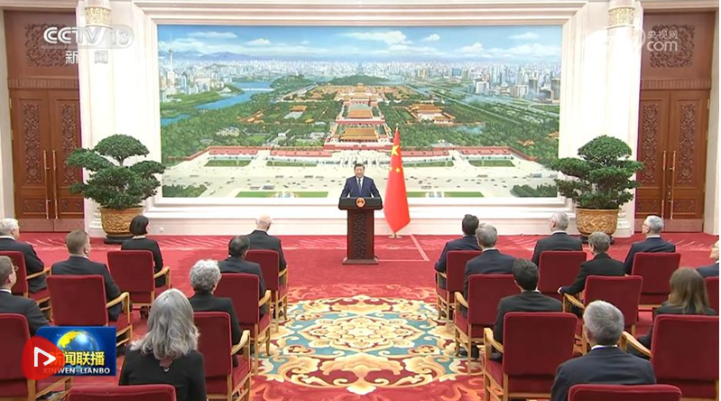 儀式結(jié)束后,習(xí)近平在北京廳對使節(jié)們發(fā)表講話。