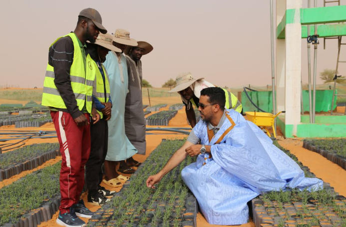 2025年5月22日,在毛里塔尼亞西部特拉扎區(qū)比爾·巴爾卡村,中非綠色技術(shù)公園毛里塔尼亞示范項目毛方協(xié)調(diào)員圖拉德·邁杜向工人傳授固沙植物種植技術(shù)。新華社記者 司源 攝