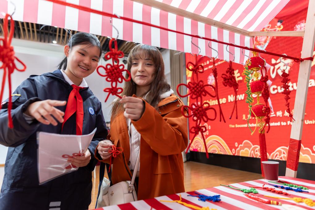 2024年1月28日,復(fù)旦大學(xué)第二附屬學(xué)校學(xué)生(左)為美國馬斯卡廷中學(xué)學(xué)生(右)介紹中國結(jié)。新華社記者 王翔 攝