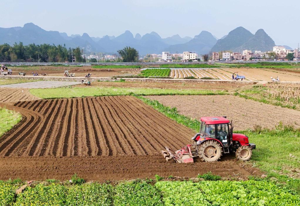 近日,廣西來賓市忻城縣城關鎮(zhèn)都樂村農民駕駛農機在翻耕田地,準備種植玉米(無人機照片)。一年之計在于春,各地人們忙著翻耕土地、培育秧苗、檢修農機、裝運化肥,為春耕生產做準備。新華社發(fā)(樊紹光 攝)