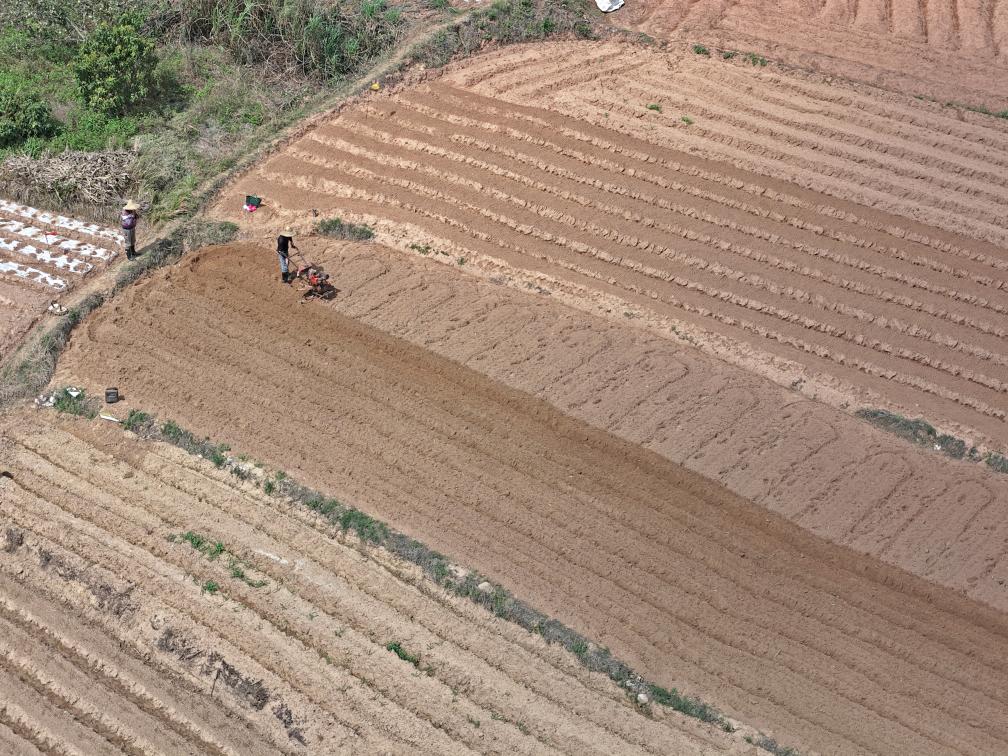 3月1日,村民在廣西南寧市邕寧區(qū)蒲廟鎮(zhèn)田園里耕作(無人機照片)。新華社記者 周華 攝