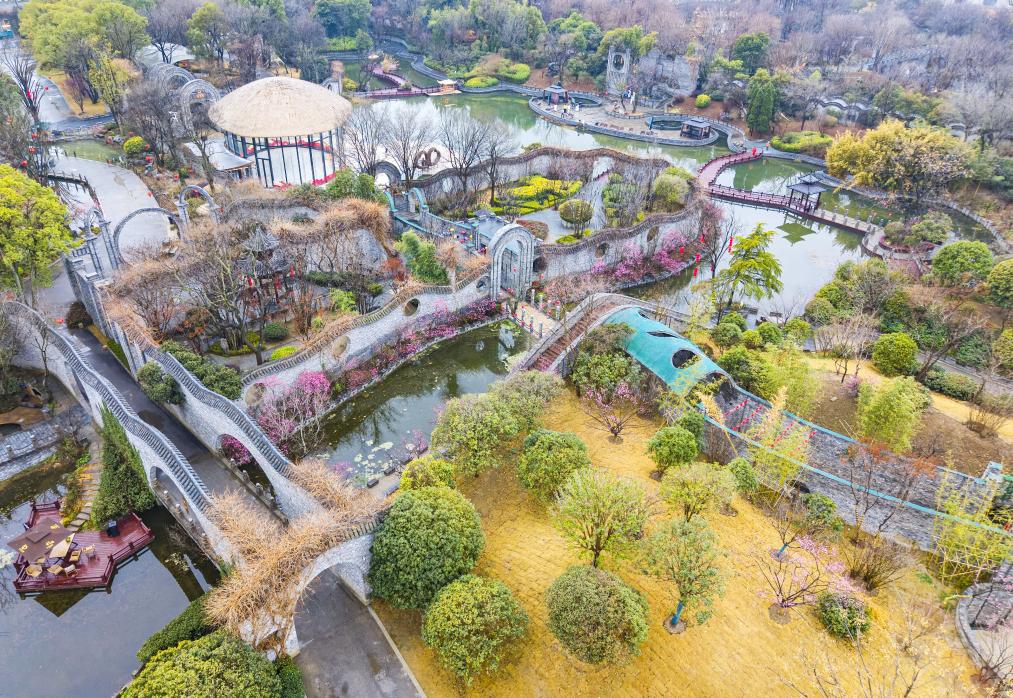 近日,游客在湖北省武漢市青山公園賞花游玩(無人機照片)。新華社發(fā)(趙軍攝)