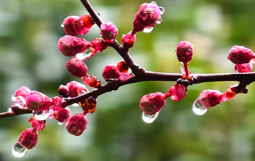 這是3月1日拍攝的河南省洛陽市街頭花苞上的露珠。一場春雨過后,晶瑩剔透的雨珠綴滿枝頭,勾勒出別樣春日景致。新華社發(fā)(高山岳攝)