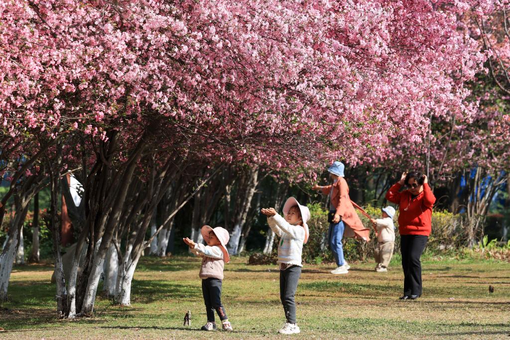 近日,游客在云南省曲靖市沾益區(qū)玉林廣場海棠花樹下賞景游玩。新華社發(fā)(孫文來攝)