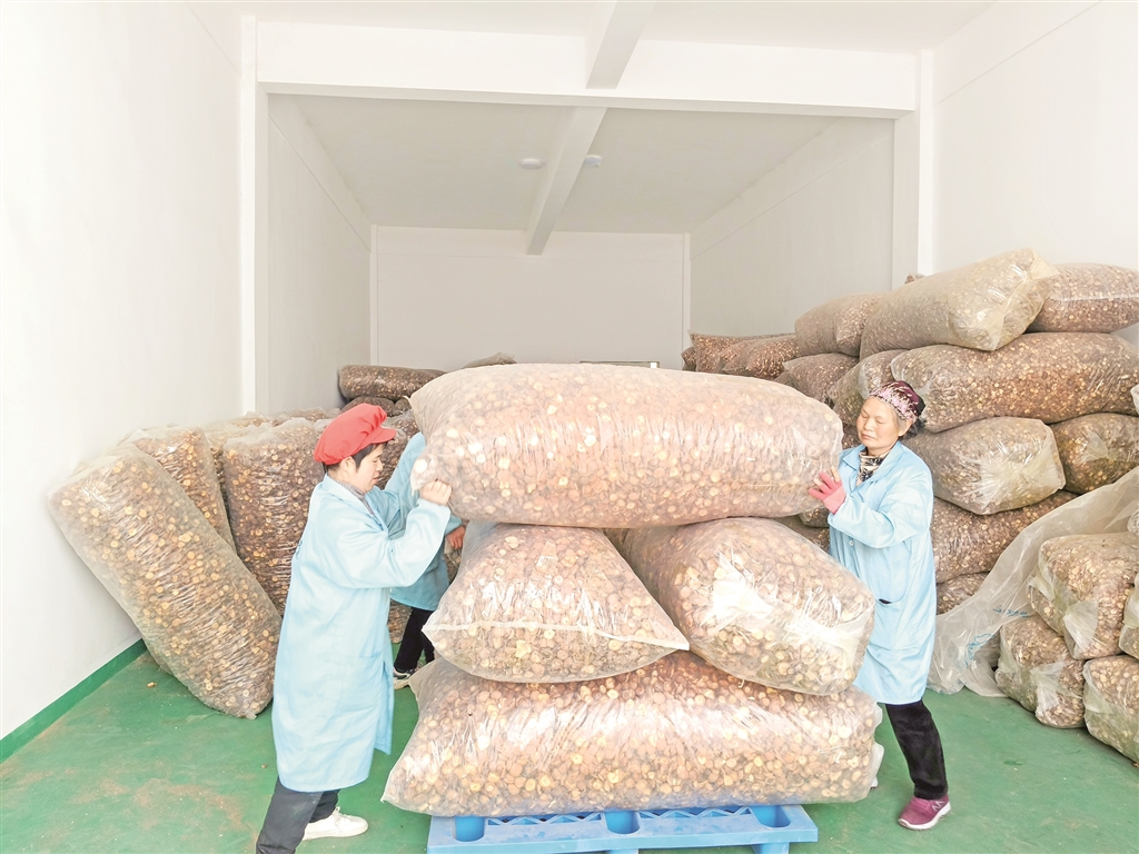 工人封裝、搬運(yùn)香菇