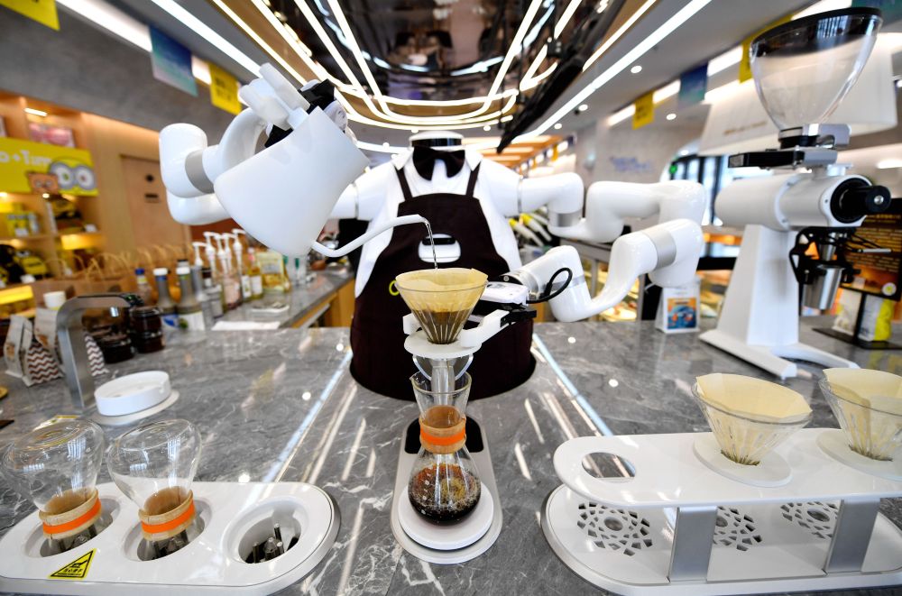 2024年1月17日,在雄安新區(qū)一家咖啡店內(nèi),AI機器人在制作咖啡。