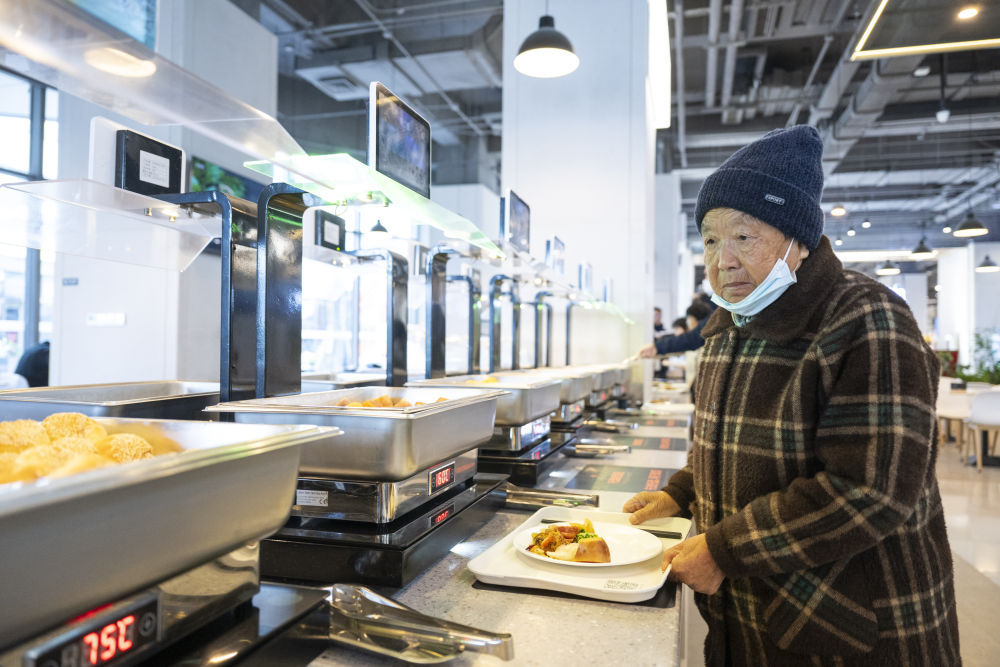 2025年11月25日,老人在雄安新區(qū)啟動區(qū)文華社區(qū)華序府智慧食堂內(nèi)取餐。在這座食堂,居民“刷臉”即可完成身份識別,取餐時系統(tǒng)自動綁定餐盤并實時結(jié)算,實現(xiàn)無感支付。此外,取餐區(qū)具備智能稱重與熱量測算功能、健康一體機可以生成健康報告并提供飲食建議。