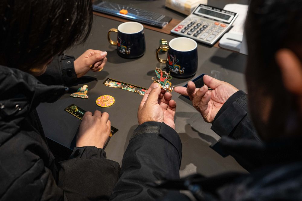 2026年1月15日,云南麗江白沙壁畫博物館館長楊志堅(右)與同事討論文創(chuàng)產(chǎn)品設(shè)計。近年來,白沙壁畫博物館持續(xù)推動白沙壁畫赴廣東、上海等地展覽,主持編纂畫冊,并推進數(shù)字化采集和文創(chuàng)開發(fā),讓壁畫藝術(shù)以新的形式走進人們的日常生活。
