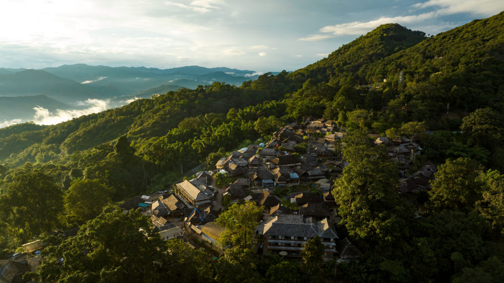 景邁山是云南普洱茶區(qū)最具標(biāo)志意義的一座古茶山,其古茶林是世界上保存完整、面積較大、種植歷史悠久的人工栽培古茶林典型代表。2013年以來,當(dāng)?shù)仃懤m(xù)實施村寨文物保護展示、消防防雷及古茶林監(jiān)測項目,優(yōu)先采用傳統(tǒng)工藝、傳統(tǒng)材料,延續(xù)傳統(tǒng)干欄式民居建筑結(jié)構(gòu)、特征和風(fēng)貌,并進行適應(yīng)性改造和性能提升,在保護傳承遺產(chǎn)真實性、完整性的同時,推動遺產(chǎn)保護成果惠及當(dāng)?shù)厝罕姟?023年9月,“普洱景邁山古茶林文化景觀”被列入《世界遺產(chǎn)名錄》,成為全球首個茶主題世界文化遺產(chǎn)。這是被山林與茶園環(huán)繞的云南景邁山翁基古寨一景(無人機照片,2023年9月18日攝)。