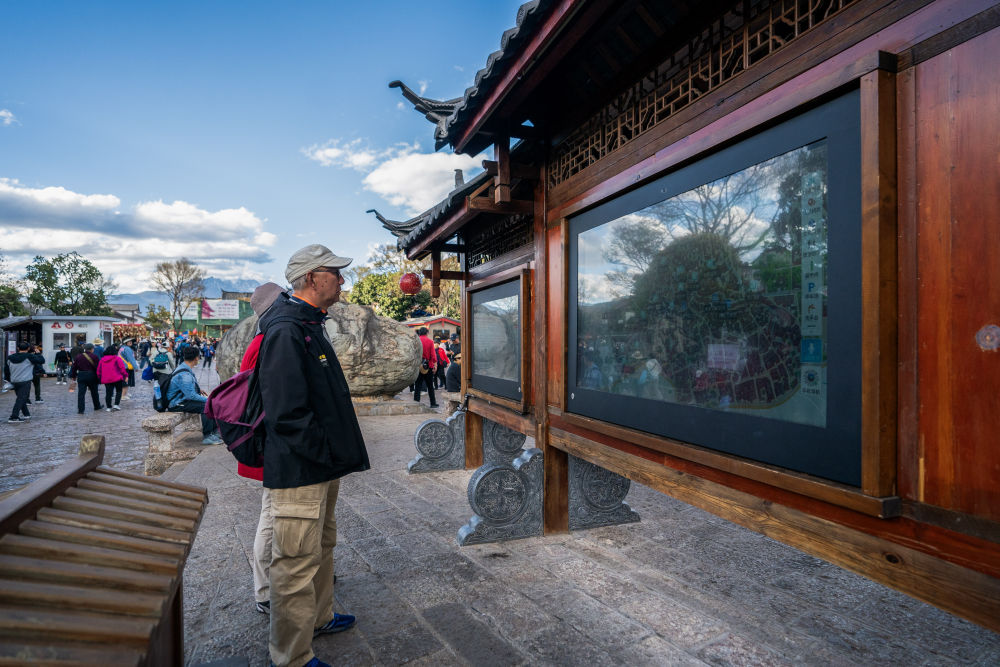 2024年3月23日,游客在麗江古城內(nèi)查看電子導(dǎo)覽大屏。云南省麗江市近年充分應(yīng)用5G、物聯(lián)網(wǎng)、大數(shù)據(jù)、人工智能等數(shù)字化技術(shù),大力推動智慧旅游發(fā)展,提升服務(wù)水平和游玩體驗,為當(dāng)?shù)匚穆卯a(chǎn)業(yè)發(fā)展注入新活力。