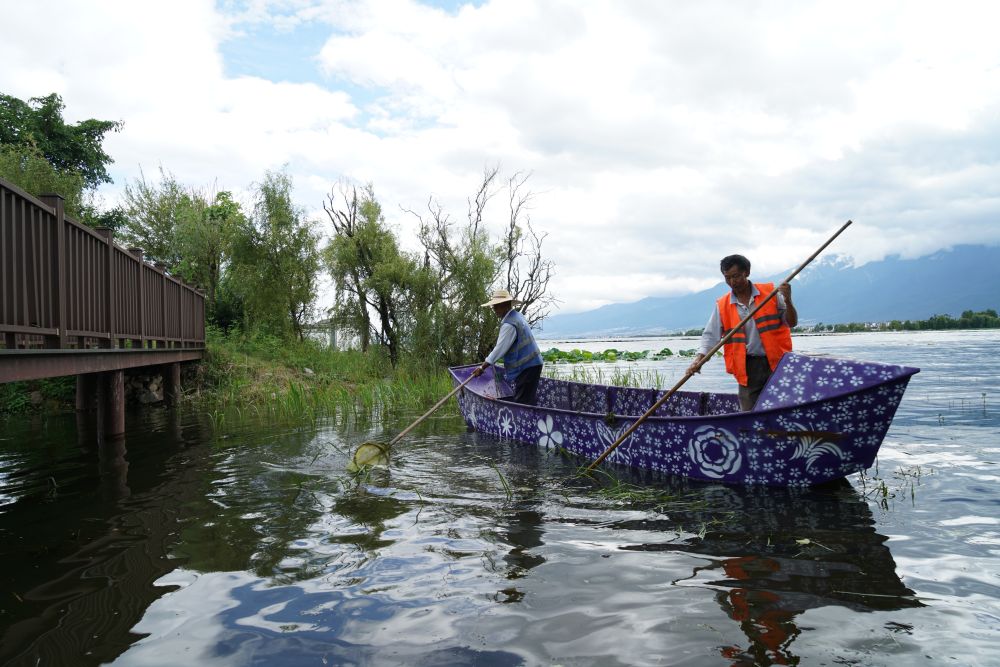 大理市灣橋鎮(zhèn)古生村位于洱海邊,是一個典型的白族傳統(tǒng)村落,已有1000多年歷史。近年來,當(dāng)?shù)刈ゾo抓實洱海生態(tài)治理,古生村也因此受益,游客數(shù)量逐漸增加,當(dāng)?shù)卮迕癯掷m(xù)增收。這是2020年9月14日,村民在大理市灣橋鎮(zhèn)古生村水域清理水草。