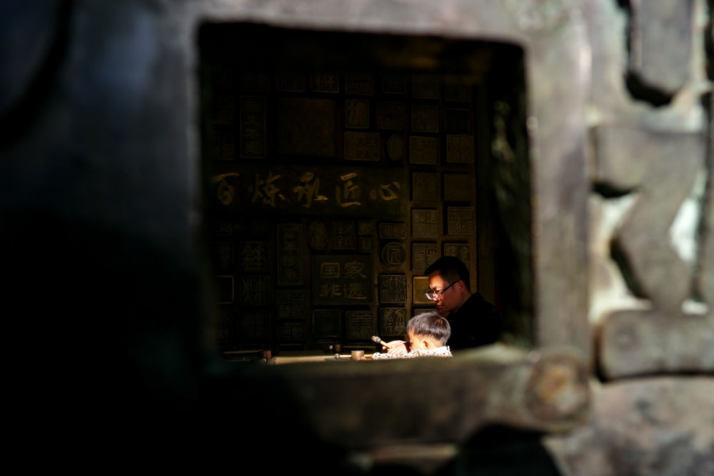 2026年3月25日,在云南曲靖會澤縣國家級非遺斑銅制作技藝傳習(xí)館,張氏斑銅第十三代傳人張偉在教兒子敲打銅器。會澤以“保護優(yōu)先、匠心修復(fù)、多元活化、融合共生”為路徑推進古城活化保護,對會館、民居等古建筑匠心修繕、活化利用,同時保留居民生活業(yè)態(tài),常態(tài)開展特色文化活動,用微改造提升古城環(huán)境。