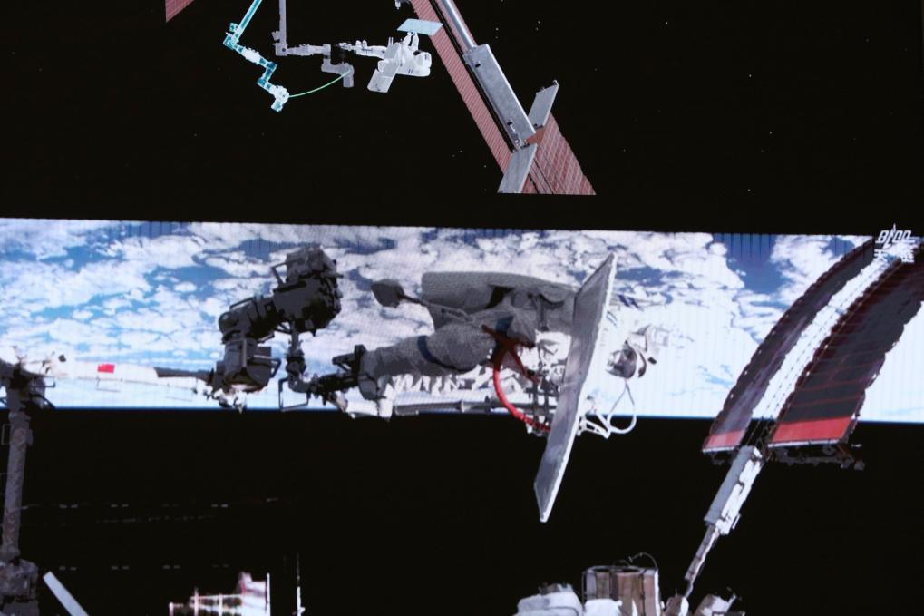 △這是2026年4月16日在北京航天飛行控制中心屏幕上拍攝的神舟二十一號(hào)乘組航天員武飛在艙外工作的畫(huà)面。