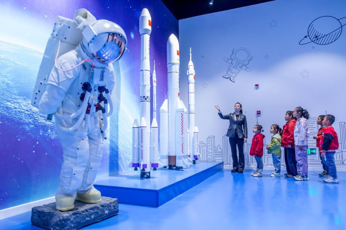 △2026年4月23日,甘肅張掖,孩子們?cè)诳萍拣^航天科普展廳近距離參觀長(zhǎng)征系列火箭模型。