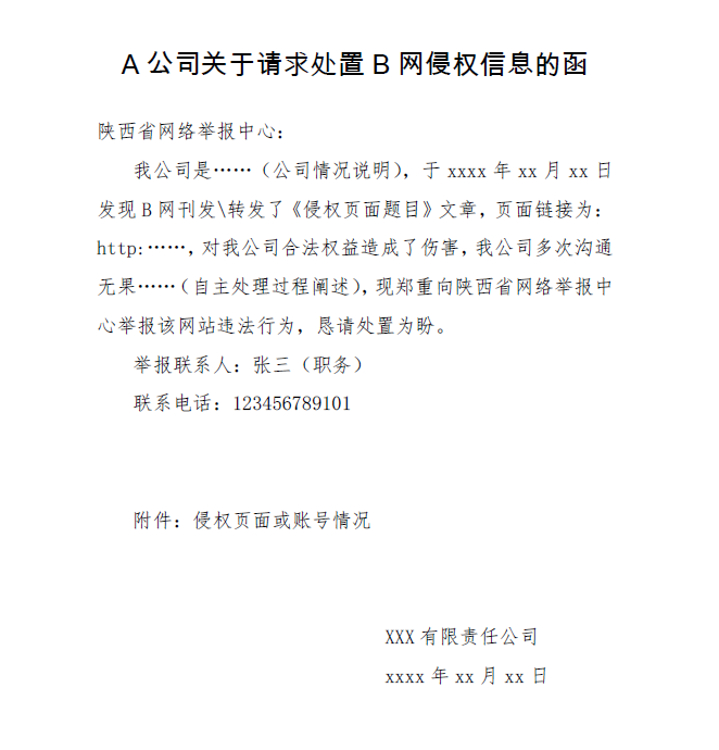 3.網(wǎng)絡(luò)侵權(quán)信息舉報請通過“侵權(quán)類”舉報入口提交,舉報人須實名舉報,同時必須提交請求維權(quán)處置函件和詳實的舉證材料。陜西省網(wǎng)絡(luò)舉報中心受理省內(nèi)各級政府組織、企事業(yè)單位和個人的互聯(lián)網(wǎng)侵權(quán)舉報,舉報行為執(zhí)行者須為政府、企事業(yè)單位等組織的責(zé)任部門或舉報主體本人,并清晰陳述侵權(quán)事實、侵權(quán)信息頁面鏈接、請求處置訴求等信息,舉證材料要盡可能詳實、完備。