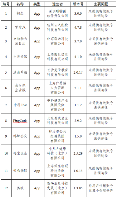 四、初念、零零汽等12款A(yù)pp未提供有效賬號(hào)注銷(xiāo)途徑或?yàn)橛脩糇N(xiāo)賬號(hào)設(shè)置不合理?xiàng)l件(詳見(jiàn)下表)。